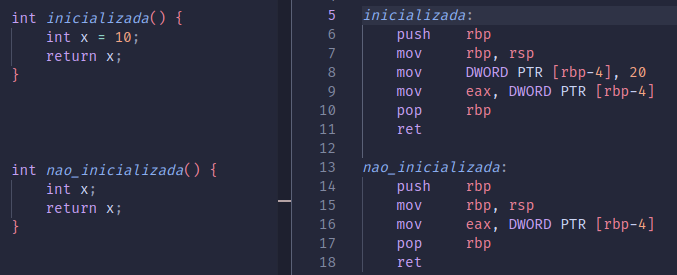 Tudo vem com um custo. Cada verificação de limite de array, cada sanitização de valores não inicializados, cada verificação de null pointer, cada detalhe que tantas linguagens tratam automaticamente vem com um custo. Pode ser um custo mínimo, como no exemplo abaixo: a diferença entre um valor não inicializado e um inicializado é literalmente uma linha a mais no Assembly final: